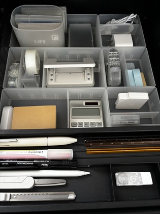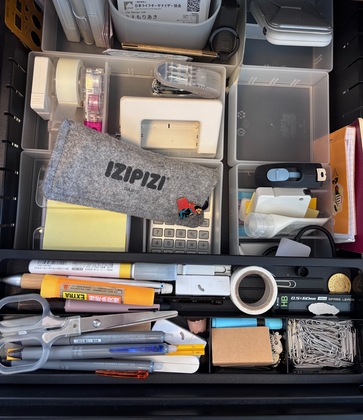 今回の引き出しでは、文房具や気軽に買えるペン、瞬間接着剤、とりあえず入れた外国の小銭など、イレギュラーに入ってくる物が多いことが分かりました。ところが、それらを受け止めるための場所が用意されていなかったのです。また、いつも使うメガネを置いていく定位置もありませんでした。